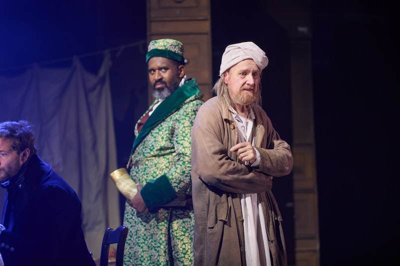 For his backdrop, Wills has constructed what can only be described as a set of ‘towers’ made from boxes and cabinets piled on top of each other. 15 metres high and scattered all over the stage, these ‘towers’ are oppressive and intimidating, functioning at first to convey the monotony of Scrooge’s office – and then later to represent the tall buildings of Victorian London. At the back of the stage, there is a thin screen onto which are projected various effects, including falling snow, ghostly silhouettes, and warm light. Scrooge’s desk is wheeled on and off: it’s an imposing structure, designed to ensure Scrooge towers over his lowly employee, Bob Cratchit. Other structures come and go on wheels: a luxurious throne for the ghost of Christmas present; Scrooge’s four-poster bed; and, at one point, even a headstone. The stage is mobile and in constant flux – and yet somehow, it never feels chaotic, in part due to careful choreography (by Georgina Lamb) and well-practised transitions by the cast.