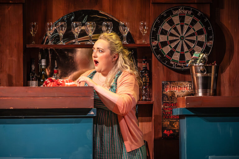Simon Bejer’s design replaces the original setting of Bunthorne Castle for The Castle, a pub frequented by emo goths (the “love-sick maidens” of the original, reduced from the original 20 to just three). The eponymous Patience (Catriona Hewitson) is now a barmaid rather than a milkmaid. Still, she remains an ingenue who has yet to fall in love – unlike her customers, who fall in love at every turn.