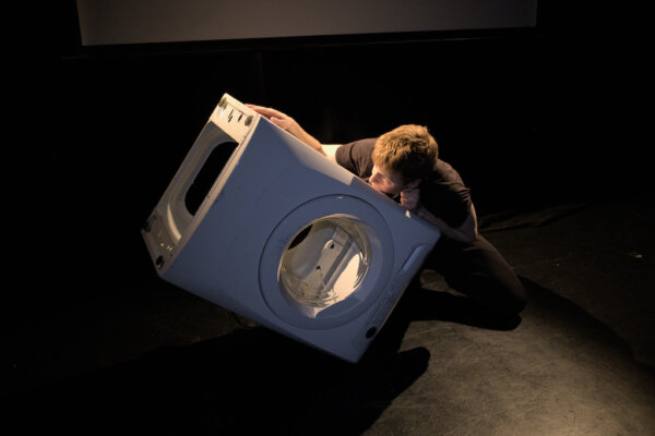 Tesink’s character develops a definite thing for the washing machine. He strums it, pokes at it, plucks it, and blows through its hoses in an effort to wheedle a tune. He rolls around on the floor, seemingly mimicking the spin cycle. He takes selfies with it, removes parts from it like so much hidden treasure. He cuddles and caresses the drum like a wanton lover. At one point he (with admirable dexterity) gets inside it and wheels it, Dalek-like, around the stage. All this is about as interesting as it sounds.