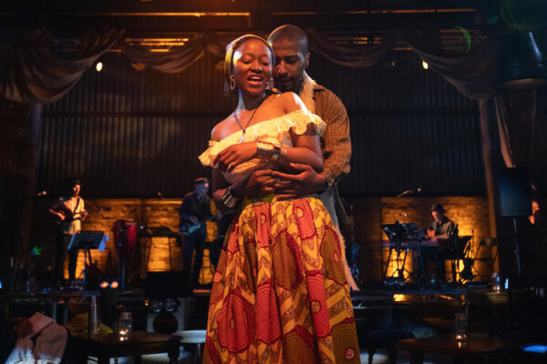 London’s docklands, once the heart of a global trading network, is a great site-specific location for a work that explore themes of international immigration. International flights constantly arriving and departing from London City Airport provide an atmospheric (if noisy) backdrop. Director Burton makes inventive use of the venue’s immense space, with scenes unfolding behind a well-stocked bar, on stage with a tremendous live band, and at various tables scattered amongst the audience. But despite superb lighting design from Peter Small and valiant efforts with a haze-machine, the factory is just a little too cavernous to achieve the kind of cabaret intimacy the narrative suggests. Sometimes one has to strain to see and hear what is going on.