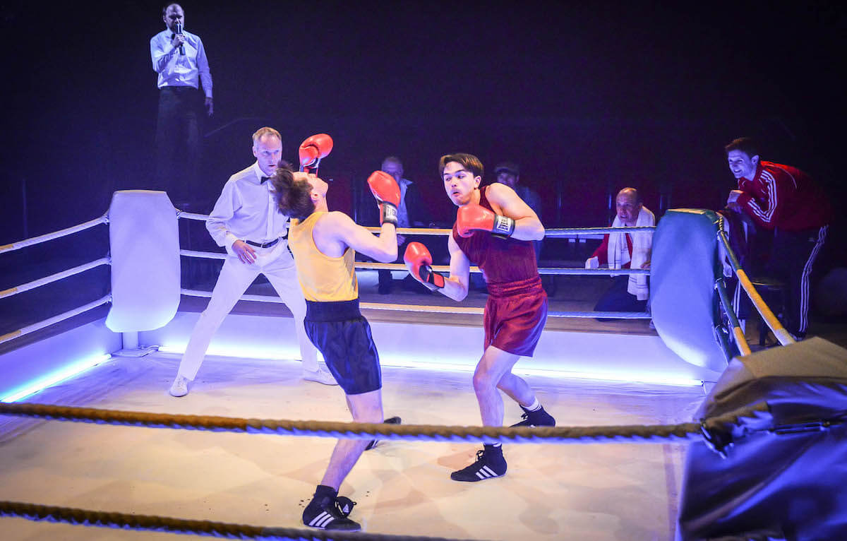 This is a fine debut play by Jamie McGough, with tight direction from Corey Campbell driving the story on. It’s presented in the round on a stage set up as a boxing ring: the actual boxing sequences are quite beautiful, almost balletic while retaining a certain atavistic nature. These movement sequences are a triumph of collaboration between McGough himself, bringing his intimate knowledge of the sport, and the movement direction of Campbell and Lucy Glassbrook. And the boxing ring is also, of course, an appropriate metaphor for the gladiatorial face off in court.