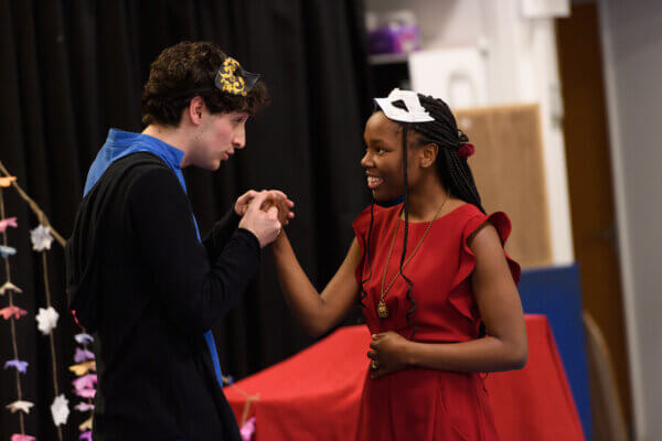 It’s difficult to assess how many of the lines got across to the young people in the audience. He sets a rapid pace which, together with the tendency to shouting and horseplay, may cause problems. But the Capulets and Montagues are clearly distinguished, with clever colour coding in the simple travelling set and costumes – there’s also a nice explanatory section at the beginning.