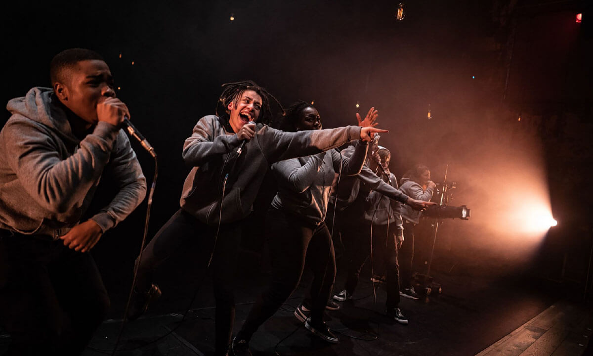 It’s powerful, punchy and poetic when it sticks to the original material, but the beatbox covers of existing tunes feel a bit hackneyed, a frittering of the talent contained onstage. It’s only ten minutes or so in, with the switch to original lyrics and brand new sounds, that the audience gets to see the true life, power and passion of this six strong cast, and strong they are. Stand-out performances come from cast members Aziza and ABH, the latter of which is the current (and clearly well deserved) holder of the title of UK Beatboxing Champion courtesy of his seemingly superhuman vocal abilities.