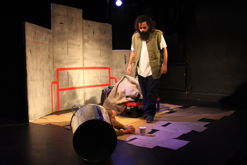 It transpires that the beggar in the dustbin (Vkin Vats) is in fact Dexi’s narcoleptic dog. In between smoking ciggies, drinking shots, sleeping, and robbing fruit from Sainsbury’s, Vats barks, whines, growls, and groans at passing strangers. “You are my brother,” Dexi tells his hound, which is about as helpful as character establishment gets here. Vaks reappears mid-way through the 55-minute piece wearing a Hawaiian shirt, and later a smart jacket and tie.