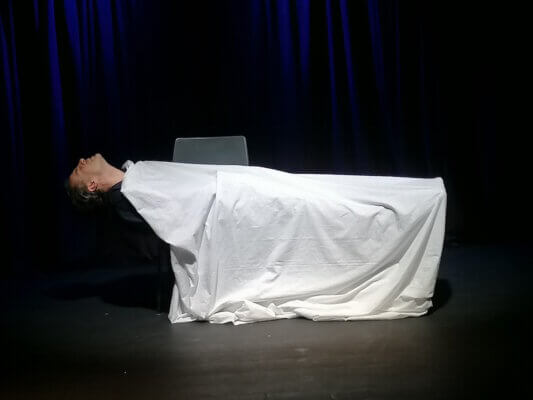 It would be wrong to call this a play. It’s a piece of theatre, an experience almost, and it would be hard to imagine it being performed anywhere other than an intimate space such as that at the Old Joint Stock. Starting from Jarman’s days at boarding school, where he was punished for his sexuality, writer and performer Mark Farrelly takes us through Jarman’s life and some of the people he met along the way. Armed only with a chair, a sheet, a torch and a roll of brown paper (and some help from the audience) – plus some excellent lighting – Farrelly digs into the heart and soul of his subject. We experience the pain of childhood, where his parents paid to send him to a school that, like so many, wanted to stop him being who he was. We see the fear and excitement of discovering that you may have a talent, and it’s something that you can use to change the world. We feel the joy of discovering that there’s a freedom, a freedom to be yourself and if that involves being anarchic, then all the better; and we see the anguish and pain of the illness that killed him at the age of just 52.