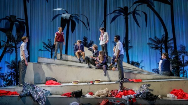 The set by Max Johns is comprised of an uneven and jagged set of platforms surrounded by lush palm trees and vegetation. This evokes both the forest and the rocky outcrops of the island and they are used effectively throughout, even becoming literally smeared in blood at one point. Nice little hidden lighting and smoke jets within the set allow campfires to burn and forest fires to rage with the minimum of fuss and the use of a small number of props is effectively evocative. Chris Davey’s lighting is excellent, and the sound design and music by John Biddle are also good, even though more than a few lines of dialogue are lost due to mixed diction from the cast (there are no microphones) as well as sound effects sometimes being a little too loud.