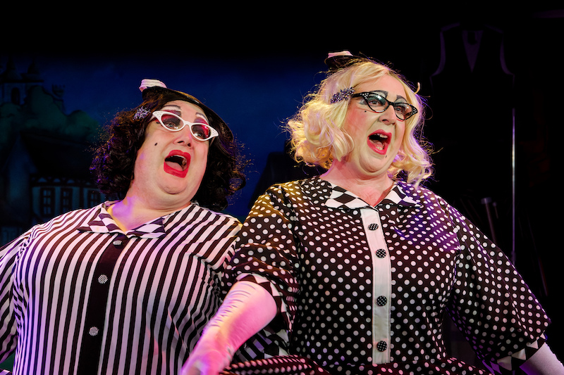 The time period in which this hour-long piece is set initially appears a bit confusing: the two dames (who, out of costume, we know only by surnames) have a much more old-fashioned, music hall-style panto delivery than is common in modern panto, especially in their first set piece, a fun rendition of Irving Berlin’s Sisters. But a number later in the panto sees the sisters dressed in 90s leisure wear, performing Right Said Fred’s I’m Too Sexy in a piece that both acknowledge is “dated”. Dialogue suggests disparagingly that casting pantos now overlooks an acting pedigree in favour of Love Island alumni – but that’s an observation that has been made for decades. Commercial pantomimes have long relied on at least one or two celebrity names to draw in audiences who then get to see a company of professionals.