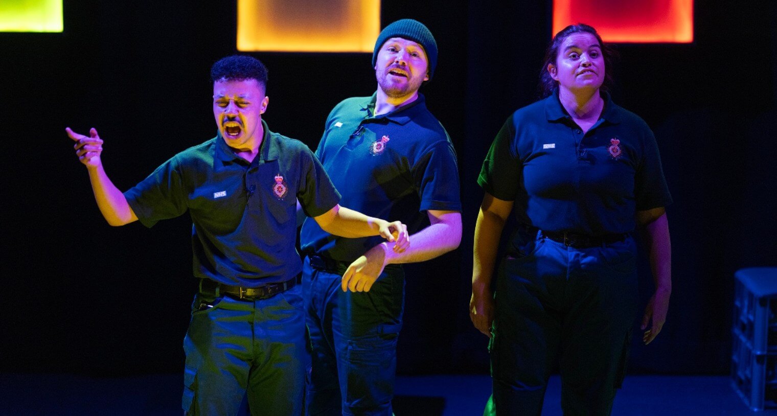 Written by Jane Thornton and Martha Godber, One Punch is an hour-long roller coaster which descends steeply from the heart-warming to the heart-wrenching. Employing rhyming dialogue and a snappy episodic structure, the show hurtles along, the joy and vivacity of earlier scenes forever shadowed by the inevitable, inescapable outcome. The three paramedics (Ellis Basford, Camille Hainsworth Staples and George Reid) leap effortlessly between roles, with a standout performance from Reid, who demonstrates a near chameleonic transition between characters – as believable playing a grieving father in his 50s as he is an intoxicated young man serving up chat up lines in a nightclub.