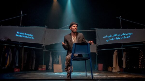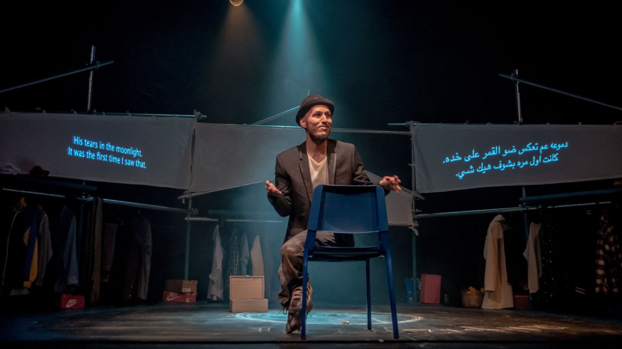 As the lights go down on Jida Akil’s sparse set — bare except for the border of white tent linen and an eclectic mix of jackets hung on rails — we are met with a voiceover explaining the show’s English and Arabic captioning, a handy element of accessibility for the everyone, since Hamzeh code switches between languages throughout. Once Al Hussien enters into his spotlight, his easy confidence and sincerity is enough to settle us into his story, using chalk to enliven the blank canvas of a stage and act as a visual aid for his stories, a clever technique that comes to feel somewhat repetitive by the end.