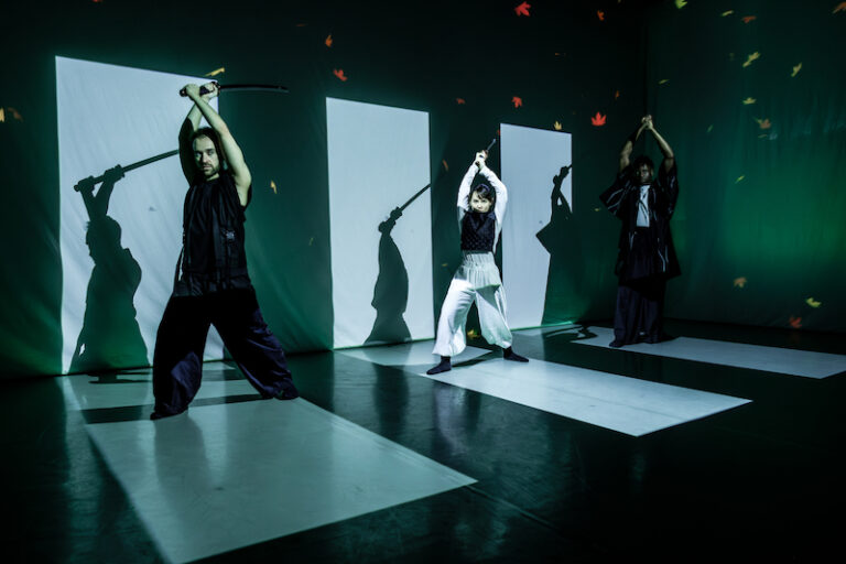 Dominated by a series of moods, Yukiko Masui’s innovative immersive dance anime performance RONiN arrives at The Place following a performance in Huddersfield. Based on a class of samurai warriors but refigured as a female story and taking place across the seasons in Japan, there is a filmic quality to the choreographed stage fights between the protagonist and her adversaries that continually redraws the boundaries between enemies and allies while conjuring a variety of locations and tones against a beautiful and sometimes grave Japanese landscape.