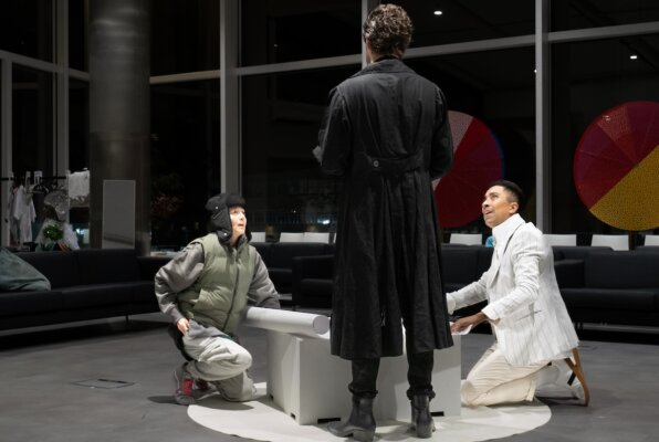 One of the hallmarks of the company is its frequent use of found spaces for its productions. This is very much true on this occasion where the performances are being staged in the common room of a university building. The very modern aesthetic of the space has clearly influenced the decision to update the piece to a contemporary London still dealing with a pandemic.