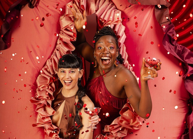 Choreographed and performed by Amarnah Ufuomo Cleopatra and Stefania Pinato, they prove welcoming hosts, the “consciousness of the womb,” as viewers arrive through the draped birth canal from the bar area into the warm and inviting womb represented by a vulva shaped sculpture designed by Emma Williams that certainly sets the scene. The scrunched fabric of Williams’ creation is replicated in suspended lights that may be eggs or follicles spaced around the womb, in which Barnaby Booth controls the lighting design that shapes the very different purposes of Womb Party.